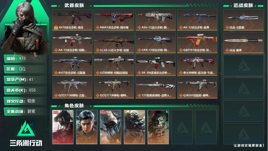 总资产102.8M 5干员外观 1近战 20传说枪械 烽火:黑鹰 战场...¥2000.00